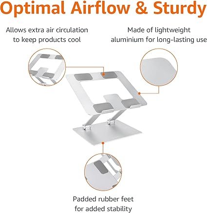 • Sturdy and Durable Construction: Crafted from lightweight, rust-resistant aluminum with a loading capacity of 11 lbs (5 kgs), featuring non-slip silicone pads and protective hooks to securely hold your laptop in place
