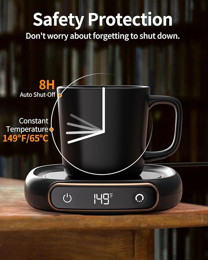 - 【SAFETY & EFFICIENCY】 Mug warmer features an automatic shut-off function that activates after 8 hours of continuous use, ensuring peace of mind and safety. Its low-power design keeps your coffee or tea warm efficiently, making it ideal for long work sessions or extended relaxation periods. Additionally, the anti-slip bottom provides stable placement on various tabletops, enhancing overall safety