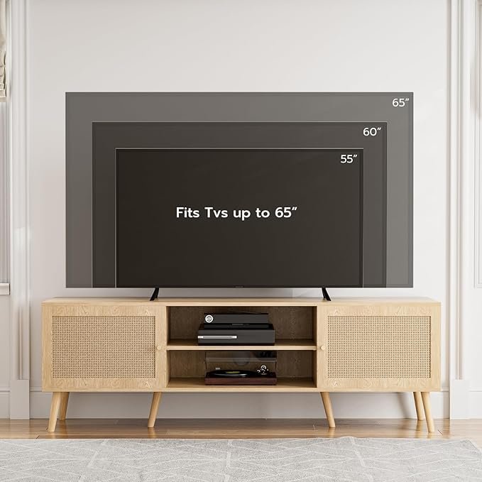 - TV COMPANION: Rattan-decorated doors match the natural surface, this TV stand with storage blends modern and boho style. If your living room is calling for a new upgrade with storage, this TV stand is a great addition